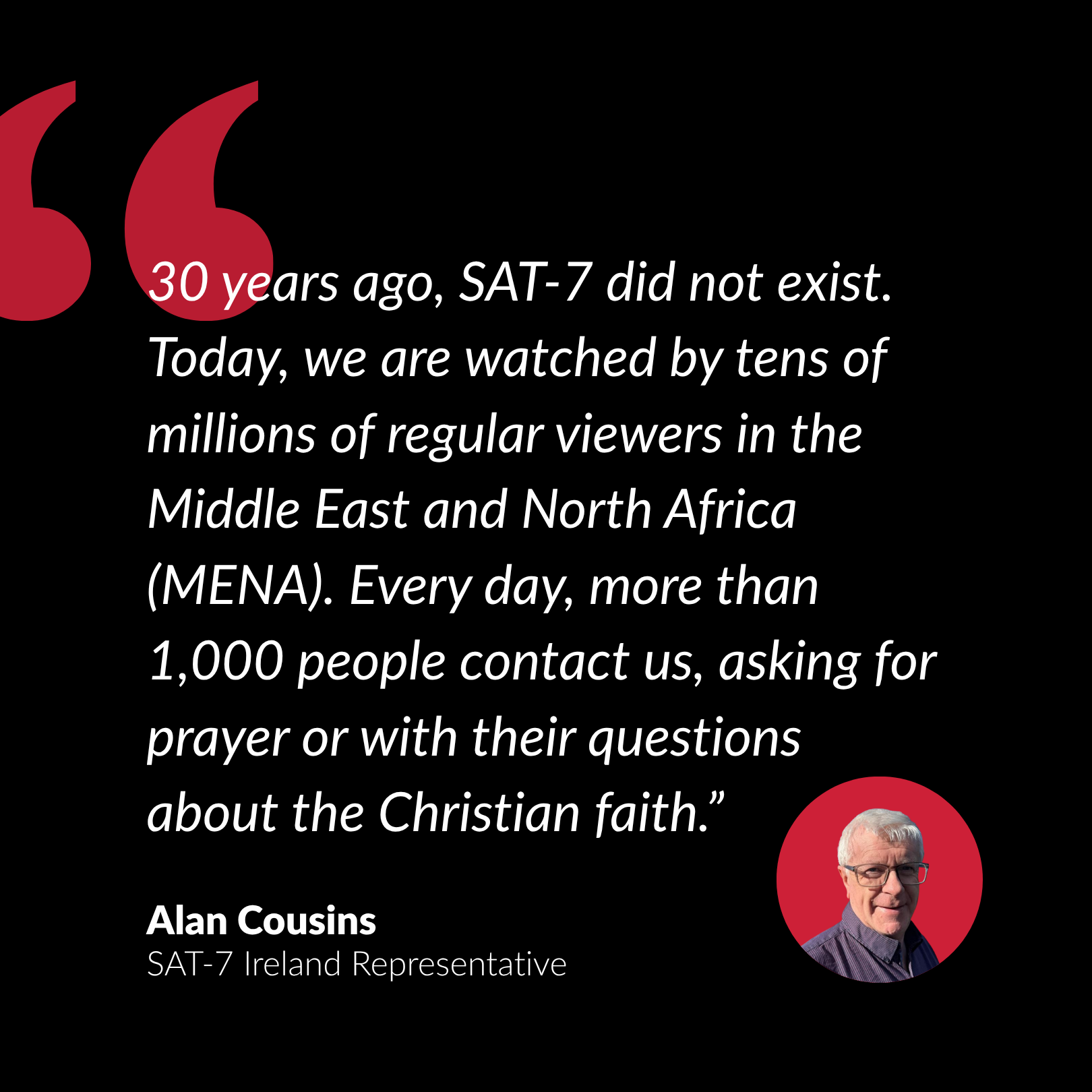 “Using satellite television, social media, and digital technology, SAT-7 can bypass barriers of censorship and illiteracy. Broadcasting 24/7 in Arabic, Turkish and Farsi, we bring Scripture, joy and hope to peoples in such different cultures and contexts.” - Alan Cousins
